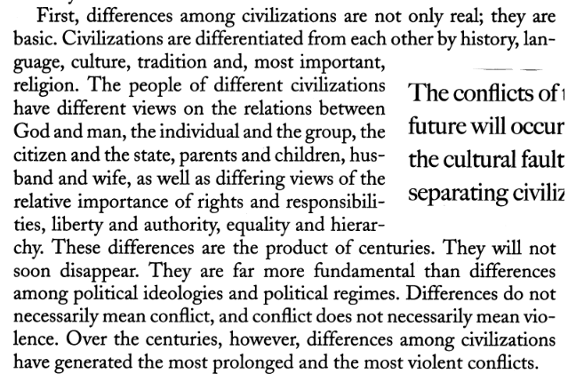 In the Foreign Affairs article, Huntington states his argument very clearly: in the post-Cold War world, the dominate sources of conflict will not be ideological or economic, but cultural.
