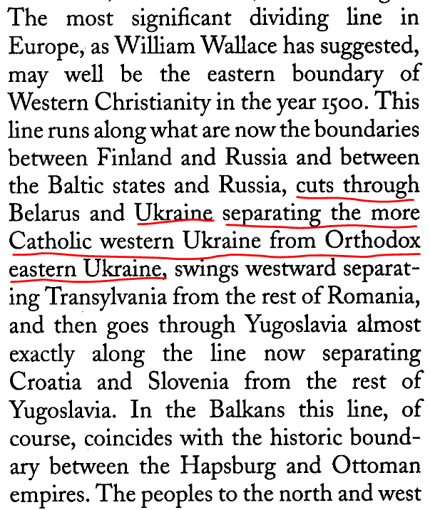 He also offers a specific prediction about the post-Cold War world: that the significant "dividing line" will be between Western Christianity and Eastern Orthodoxy, which divides Ukraine.