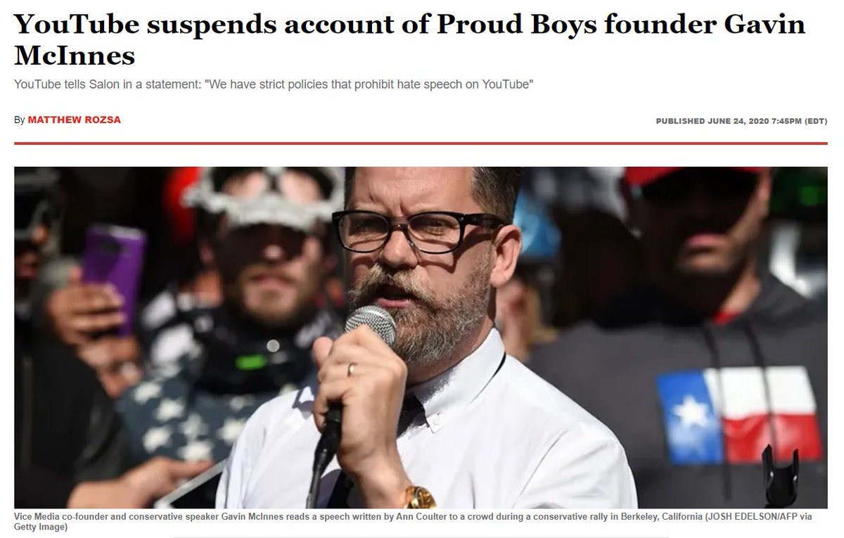 In 2018, McInnes was banned from Twitter, Facebook, & Instagram for promoting violent extremist groups & hate speech, & in 2020, YouTube suspended him for hate speech, posting content that was "glorifying [and] inciting violence against another person or group of people."