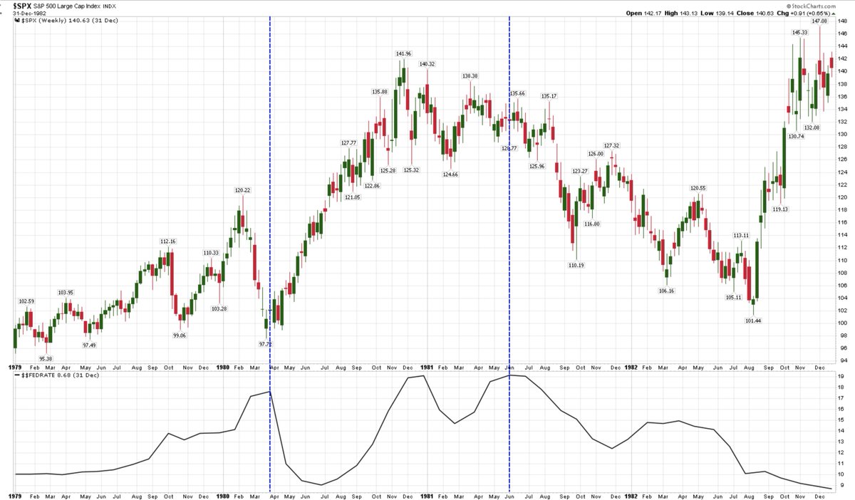 In 1980, $SPX bottomed with initial rate cut whereas in 1982 it kept declining after initial rate cut...