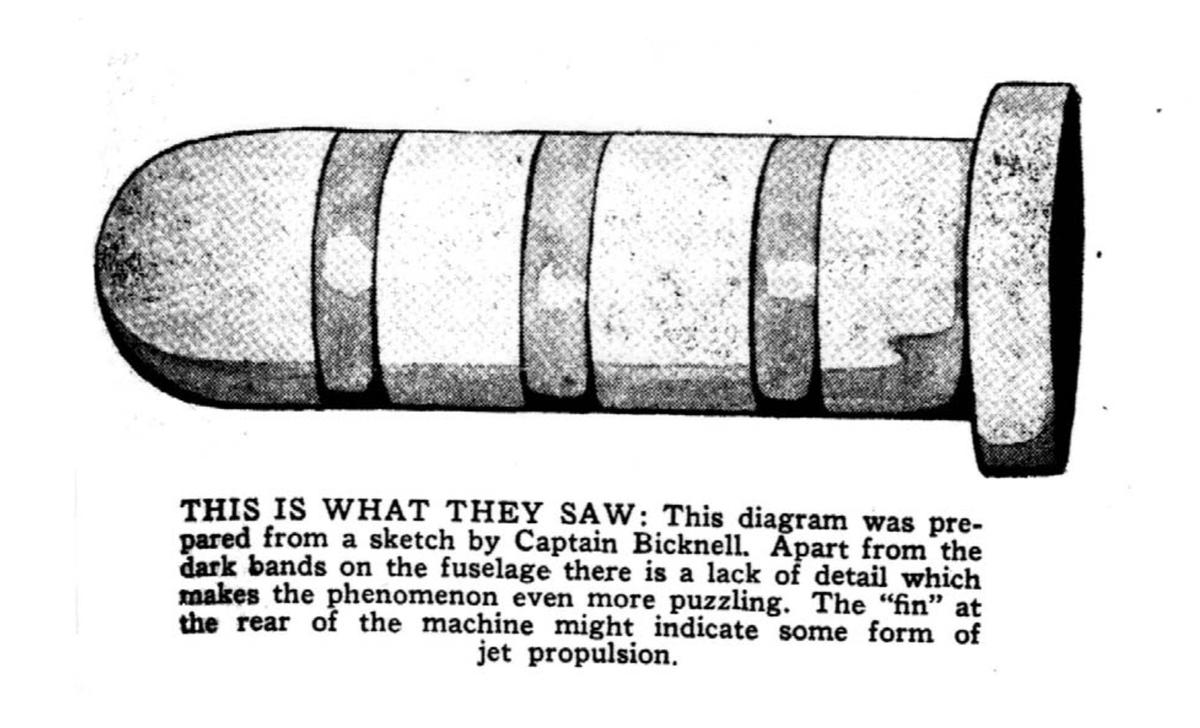 3/which must have been over 200 feet long.” It has a vertical fin at one end, and at regular intervals along the fuselage are vertical dark bands. It remains completely stationary for 17 minutes. Two passengers take photos of it. Radio Officer Roy Overstreet, a passenger, shoots