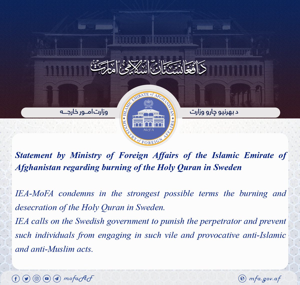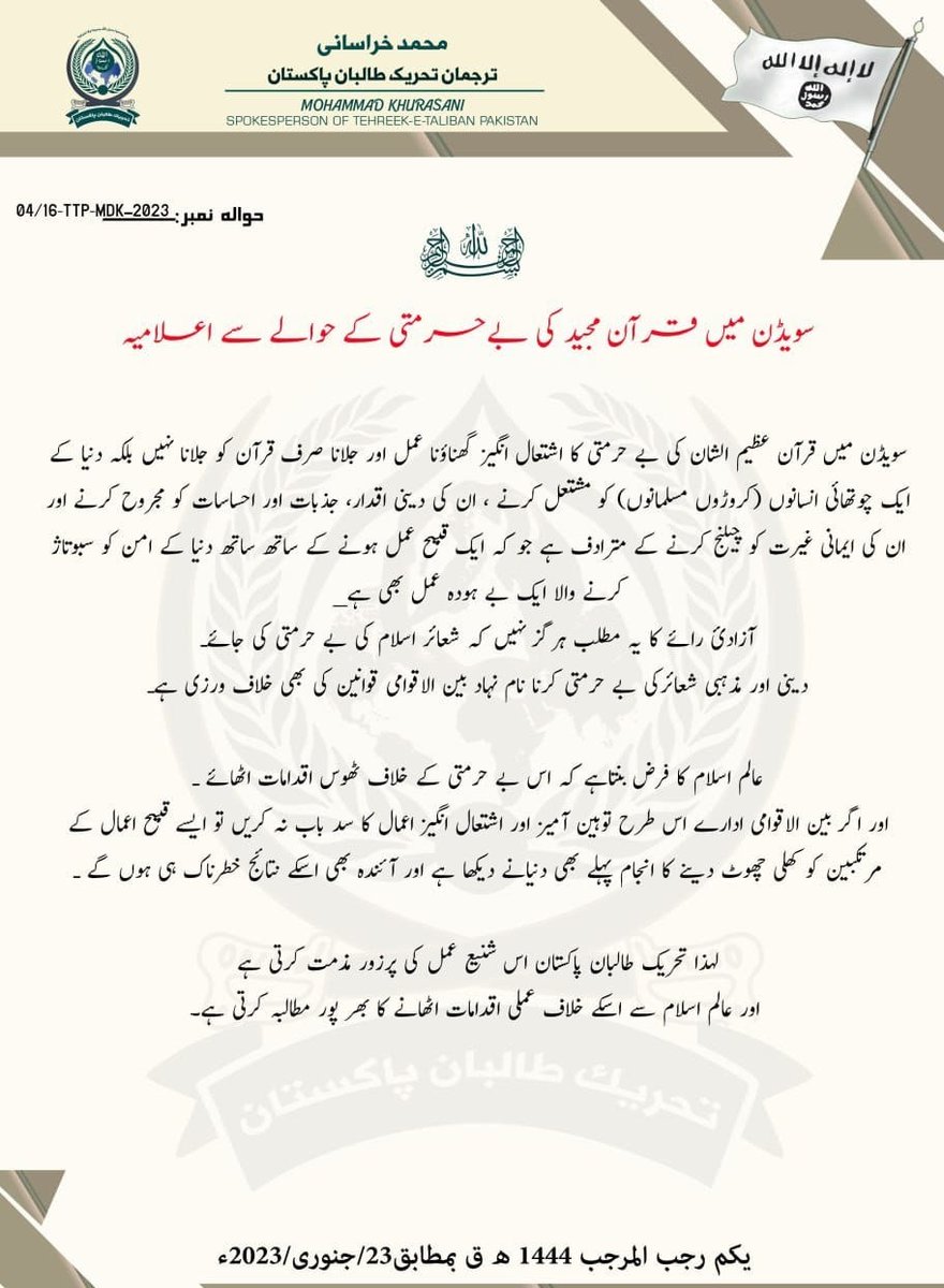 Afghan Taliban and Pakistani Taliban (TTP) both released statements condemning the burning of Quran in Sweden. TTP statement went one step ahead, calling on the Muslim world to collectively take action.