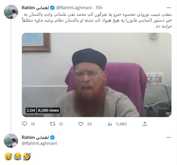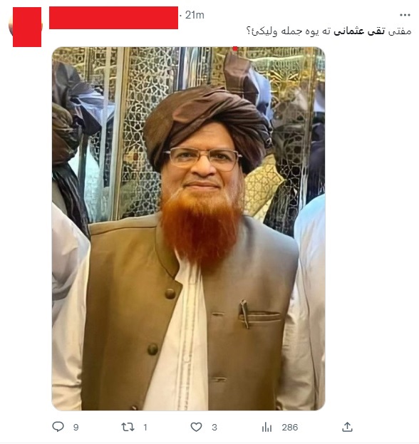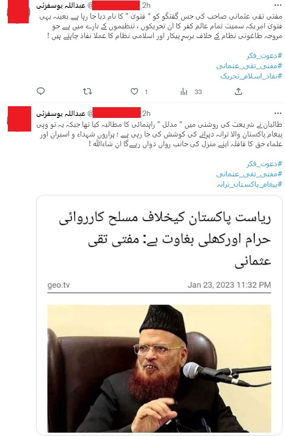 Pakistan: Pro-Taliban/TTP accounts launch social media assault on Pakistani Deobandi Islamic scholar Mufti Taqi Usmani for his latest speech via video link at the anti-terrorism Paigham-e-Pakistan conference held in Islamabad.