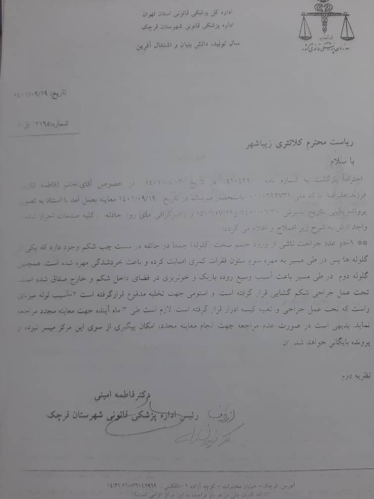 بر اساس تصویر نامه پزشکی قانونی به کلانتری زیباشهر به تاریخ ۱۹ آذر، این دو گلوله به شکم و کمر رها اناری آسیب جدی وارد کرده و مهره کمر او را خورد کرده است. خانواده رها او را به بیمارستان ستاری قرچک منتقل کردند و همان شب مورد عمل جراحی قرار گرفت اما وضعیتش رو به وخامت رفت/👇