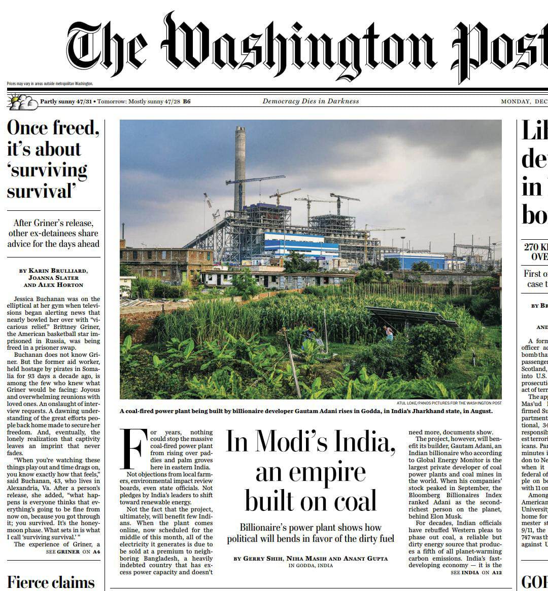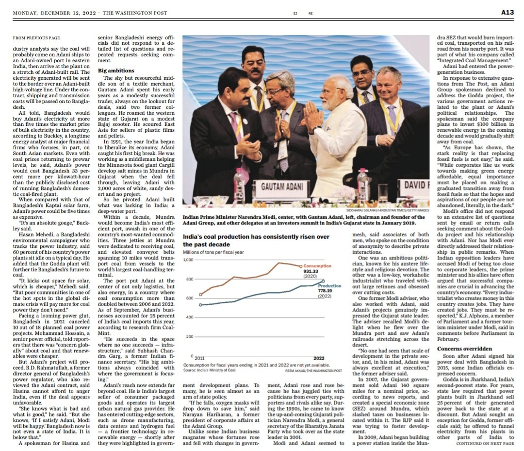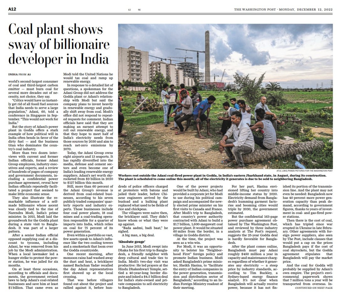 The Washington Post front page yesterday: “In Modi's India, an empire built on coal. The tale of Gautam Adani's giant power plant reveals how political will in Modi's India bends in favor of the dirty fuel.”