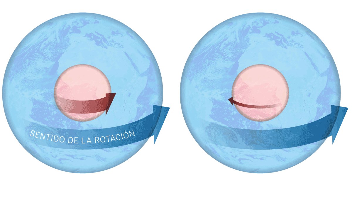 Esto quiere decir, que, si eliminásemos la rotación global que nosotros mismos experimentamos, veríamos cómo el núcleo gira en sentido contrario. Este efecto se debe únicamente al sistema de referencia, no quiere decir que vaya al revés que el resto del planeta.