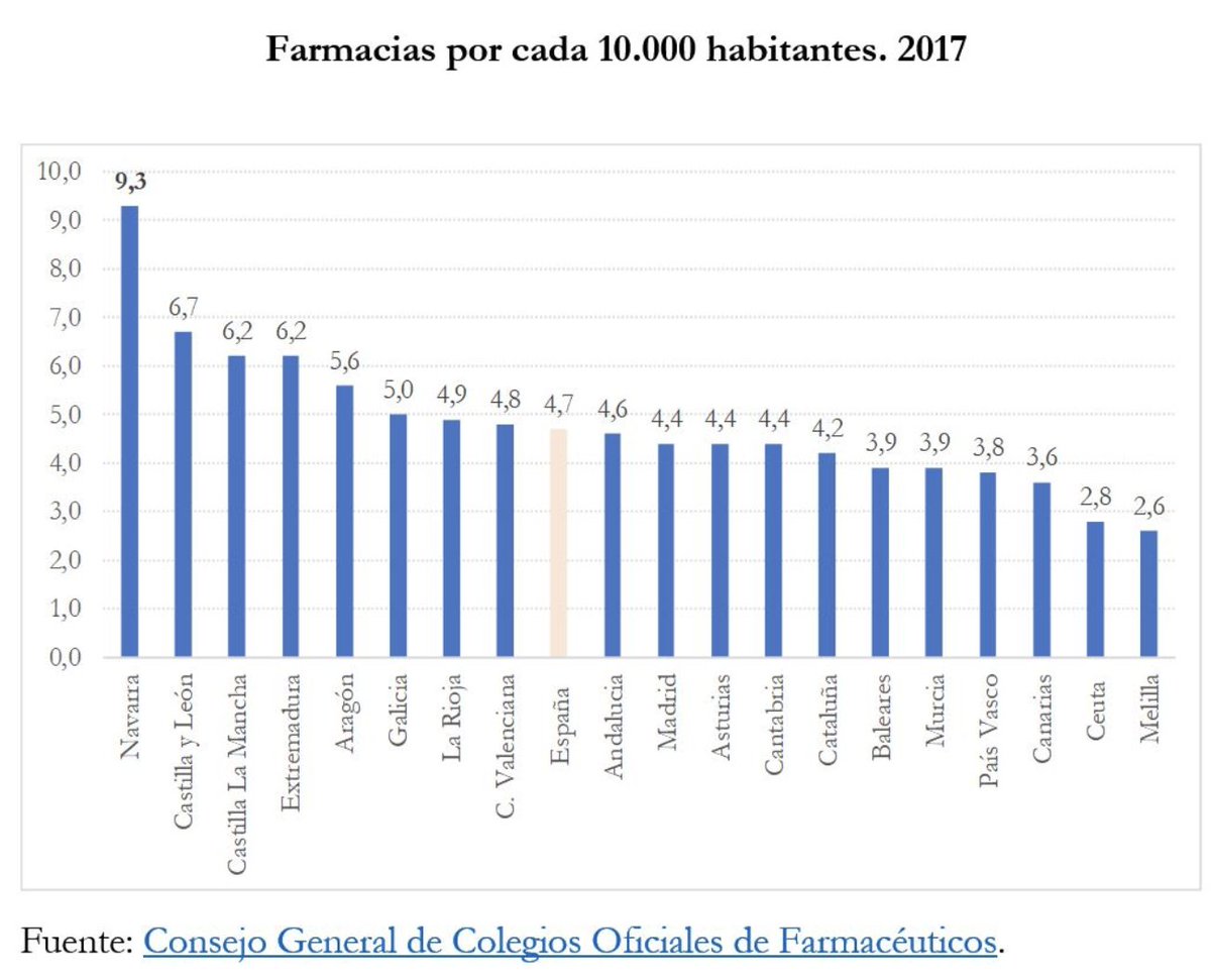 De una parte, habría más farmacias si se eliminasen las restricciones. En el año 2000 se liberalizó la entrada de farmacias en Navarra y el número de farmacias por habitante aumentó tras ello. De hecho (datos 2017), es la Comunidad con más farmacias por habitante de España.