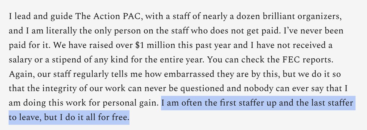 In 2020, he claimed that he works "for free" for Action PAC, which is the forerunner to Grassroots Law PAC. he urged supporters to check out FEC filings to verify he's not getting paid. He was technically telling the truth, but...