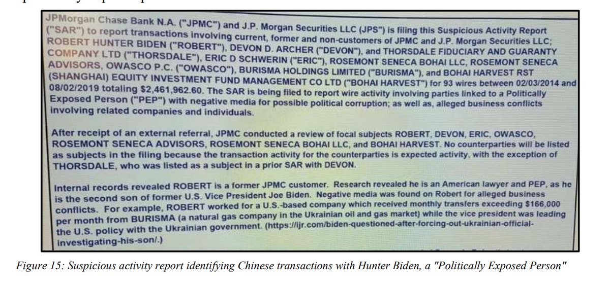 One of the Suspicious Activity Reports is from JP Morgan regarding 93 wire transfers from Hunter and his associates totaling $2.5 million.
