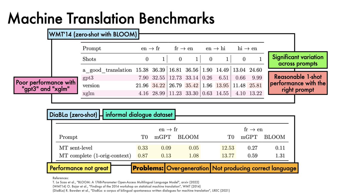 On WMT14, 1-shot BLOOM does a reasonable job with the right prompt