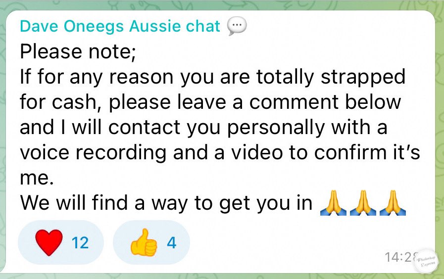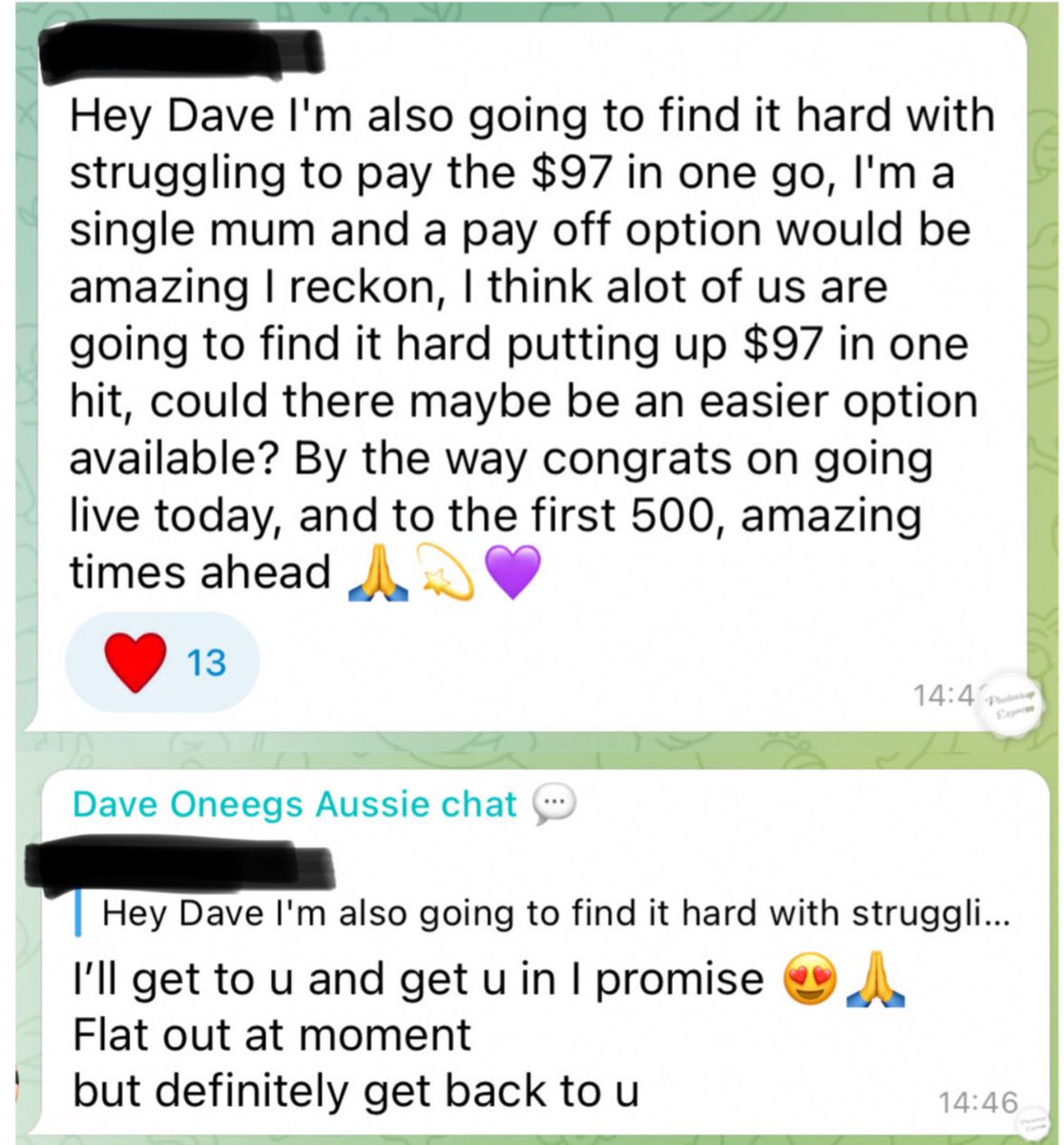 4. Despite promising the fees would be affordable, many of Dave’s followers can’t afford to pay $97 up front. Dave’s now promised anyone strapped for cash that he’ll “find a way to get them in”. Unfortunately Dave is “flat out at the moment” and “doesn’t have time”