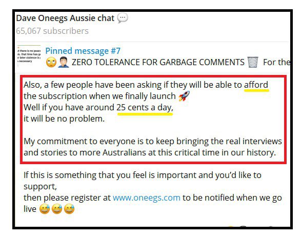 1. Ugh COVID conspiracy theorist Dave Oneegs can’t stop smiling. He launched his subscription based website yesterday. There’s talk he met his target of 500 sign up’s already. At $97 each, that’s $48,500 for providing not much!