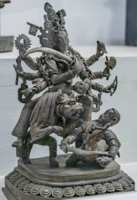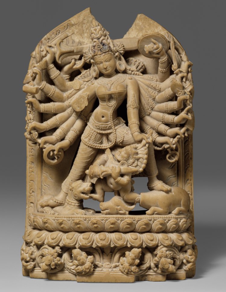 mahisha, a demon, somehow receives 3 wishes… or something. he wishes for immortality which he cannot receive because he is not a god (in vedic / hindu world). so he asks for no man to be able to kill him, that he cannot be killed in day or night, or be killed indoors or outdoors