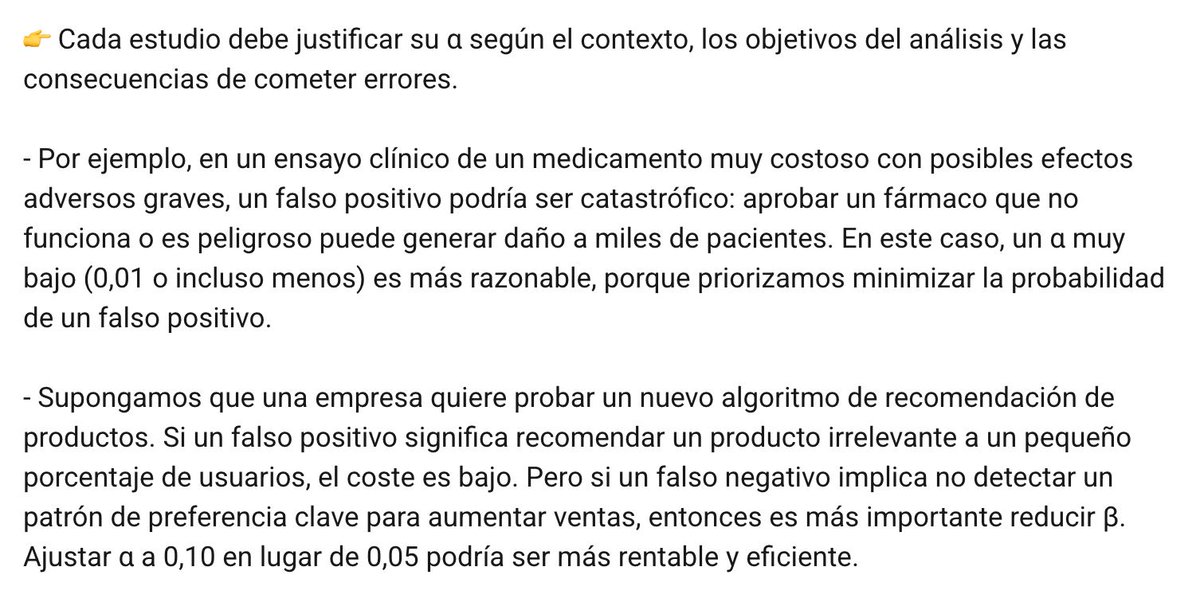 𝐋𝐚 𝐩𝐨𝐭𝐞𝐧𝐜𝐢𝐚 𝐞𝐬𝐭𝐚𝐝𝐢𝐬𝐭𝐢𝐜𝐚 es 1−β: la probabilidad de evitar un 𝐞𝐫𝐫𝐨𝐫 𝐝𝐞 𝐭𝐢𝐩𝐨 II, es decir, de no pasar por alto un efecto real del tamaño especificado. Una potencia baja implica un alto riesgo de concluir que no hay efecto cuando sí existe.