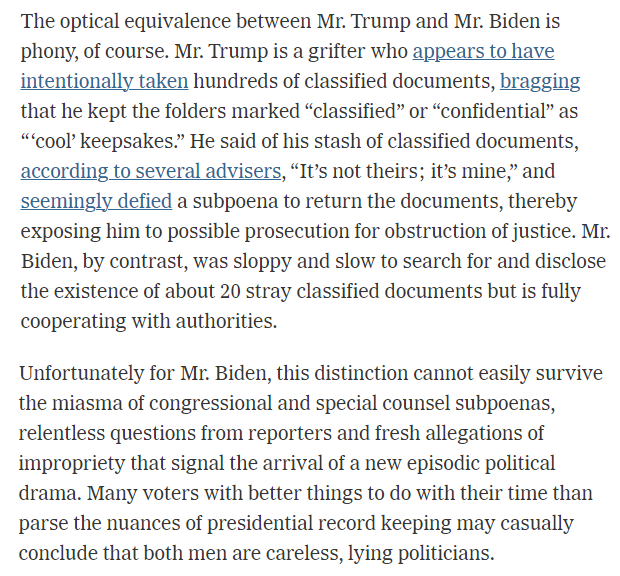 A Times column that belongs in a museum. In one paragraph, Jonathan Alter states that any equivalence between Biden and Trump on documents is "phony."