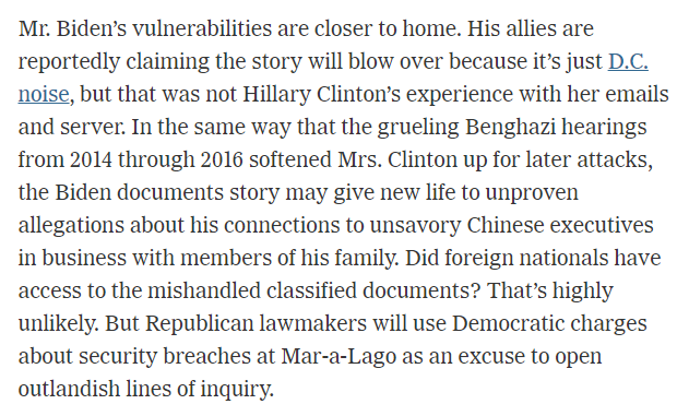 Incredibly, Alter literally compares what Biden is about to face to Benghazi, a ginned-up non-scandal that only gained mainstream purchase when the VERY PAPER IN WHICH THIS COLUMN IS BEING RUN decided to pick it up in foolhardy attempt to look nonpartisan. nytimes.com/2023/01/20/opi…