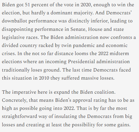 Biden was very UNpopular for most of the runup to the election. His policy agenda made NO political waves. The election REAFFIRMED the Trump-era coalition; working-class whites stayed R. Dems won where they could connect their opponents to Trump. And everyone hated the economy.