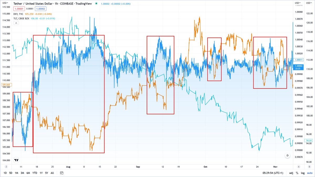 The DXY and Tether are related, that much i know, but TLT wasn't until the recent change. Since it's also related to the DXY, TLT and Tether's peg trade with a very high correlation. So correlation not causation.