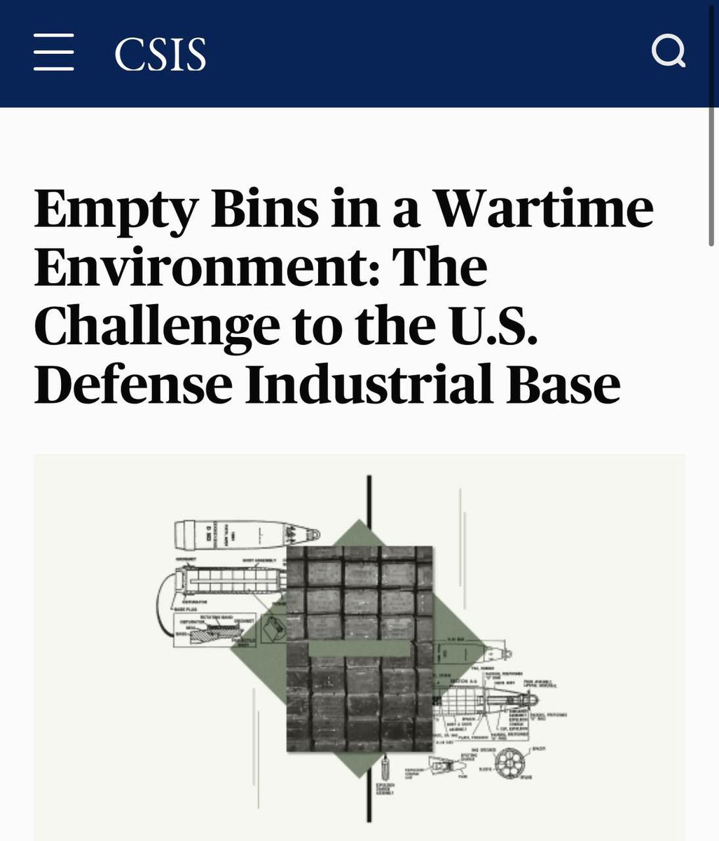 "The US military industrial base is not sufficiently prepared for today's international security environment. In a major regional conflict - for example, in the war with China in the Taiwan Strait - US use of ammunition is likely to