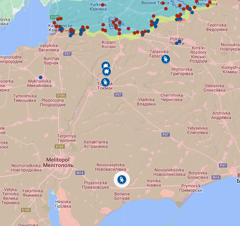 In the Zaporizhzhia area, Ukraine blew up two ammo depots (explosion markers) and a S300 (highlighted missile icon) in addition to missile strikes on Tokmak and Basan.