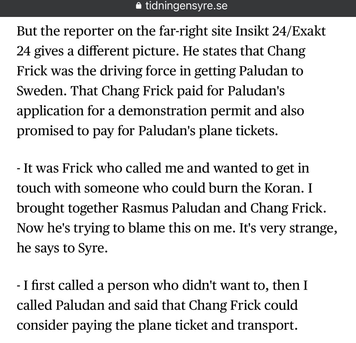 It was Frick who initially contacted them and said he wanted to find someone who’d burn the Koran - for which he’d offer to cover expenses. They recommended Paludan. tidningensyre.se/2023/18-januar…