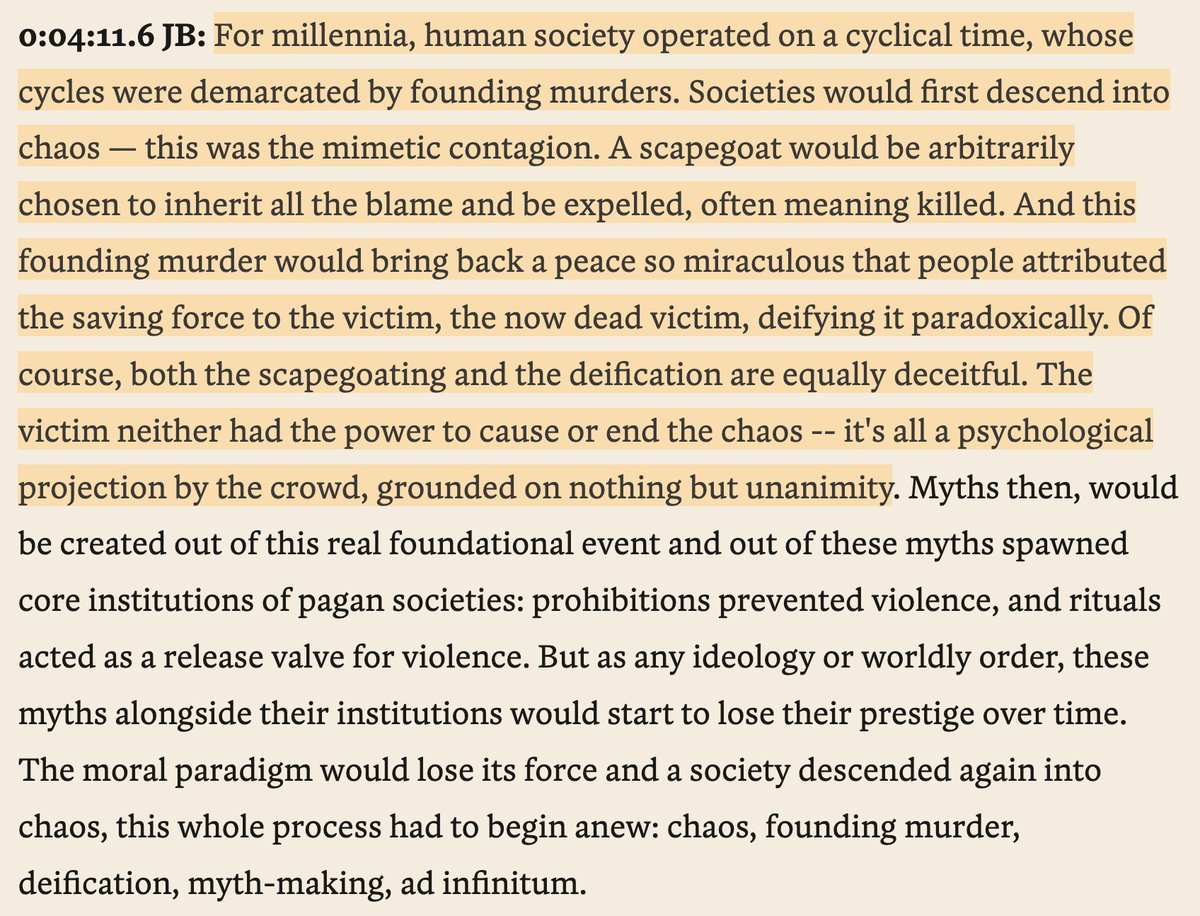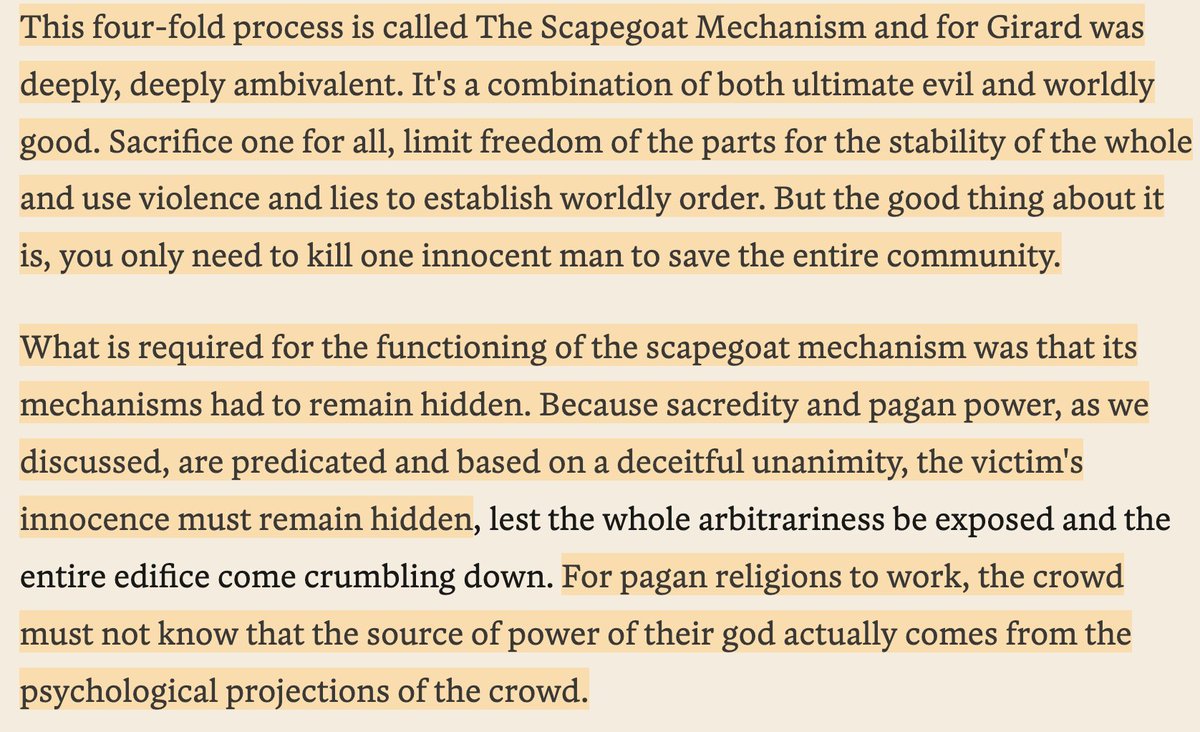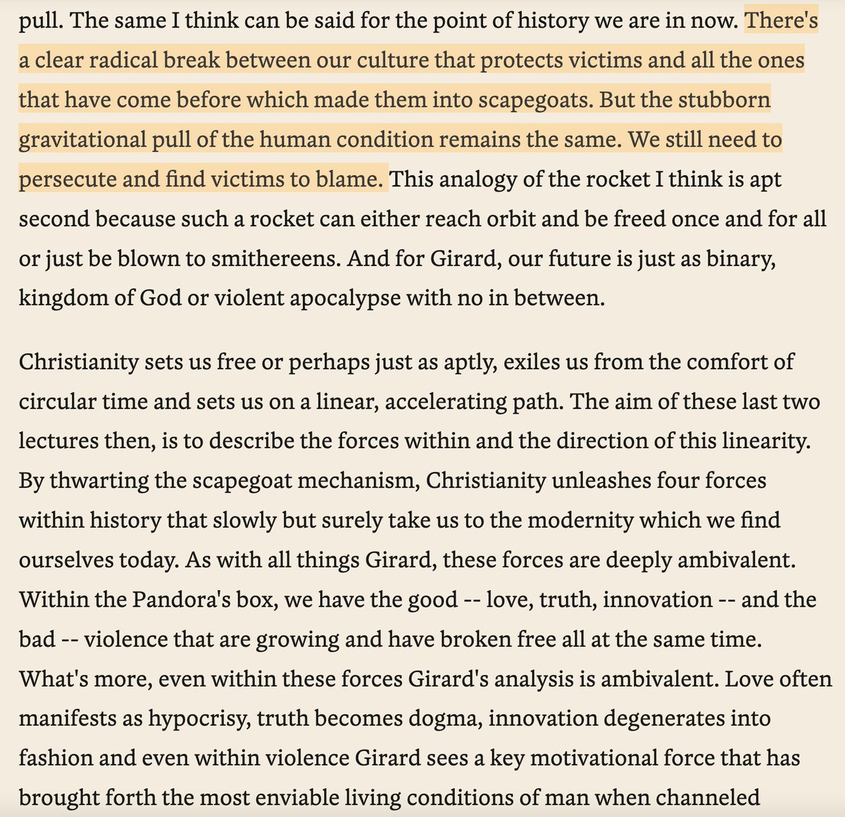 "There's a clear radical break between our culture that protects victims and all the ones that have come before which made them into scapegoats. But the stubborn gravitational pull of the human condition remains the same. We still need to persecute and find victims to blame."