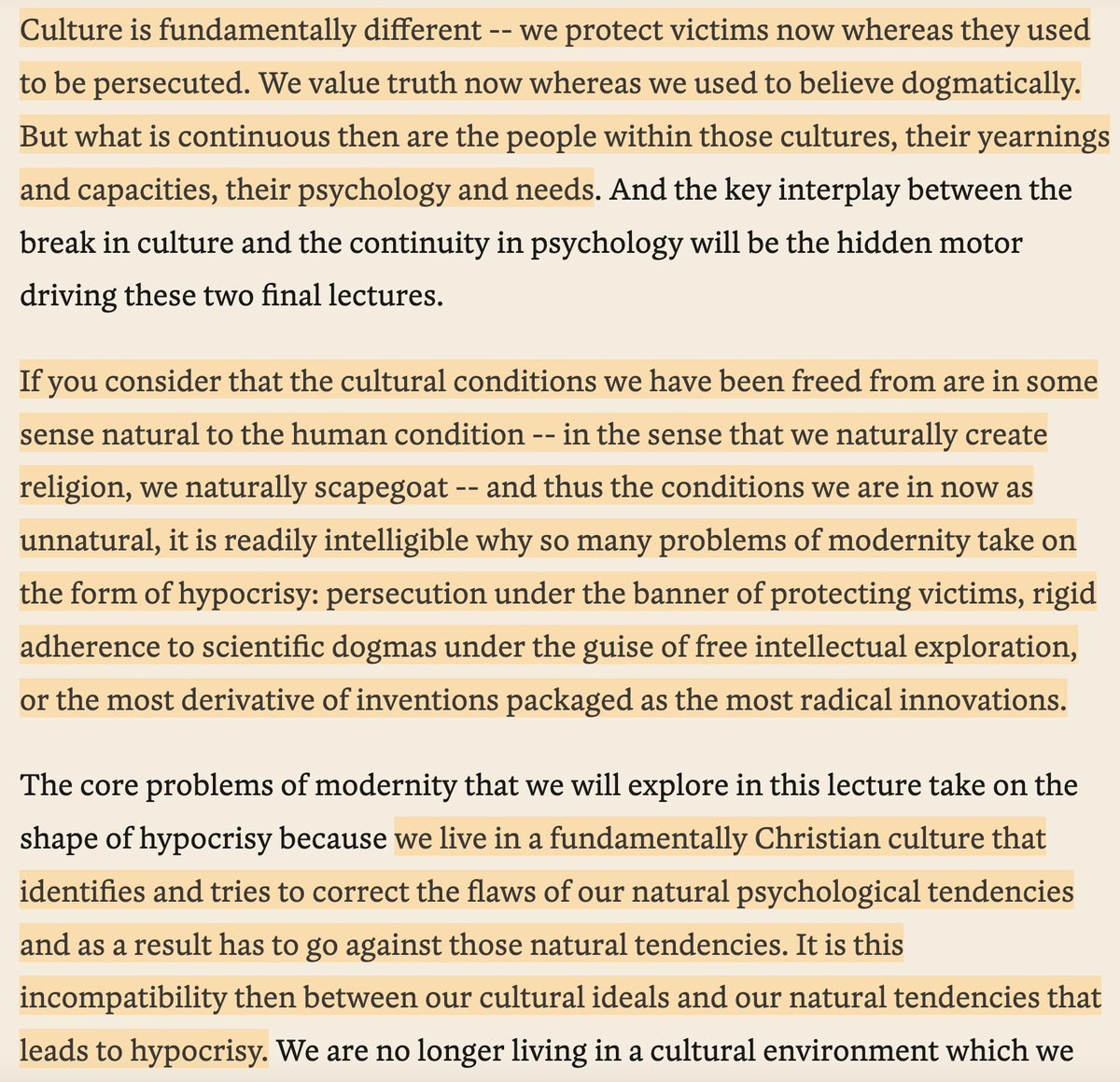 "we live in a fundamentally Christian culture that identifies and tries to correct the flaws of our natural psychological tendencies...this incompatibility between our cultural ideals and our natural tendencies leads to hypocrisy"