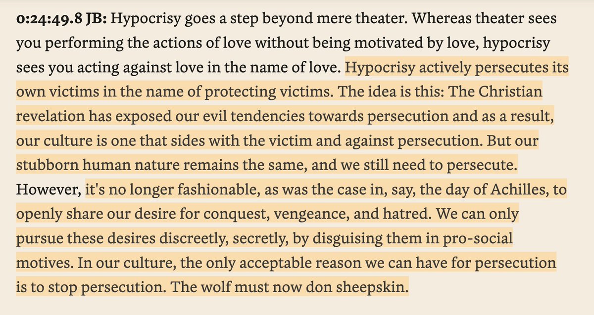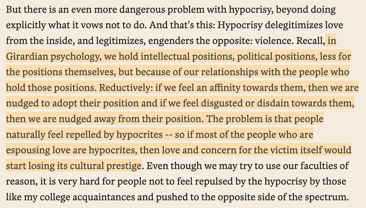 "it's no longer fashionable, as in the day of Achilles, to openly share our desire for conquest, vengeance, and hatred. We can only pursue these desires secretly...the only acceptable reason we can have for persecution is to stop persecution. The wolf must now don sheepskin."