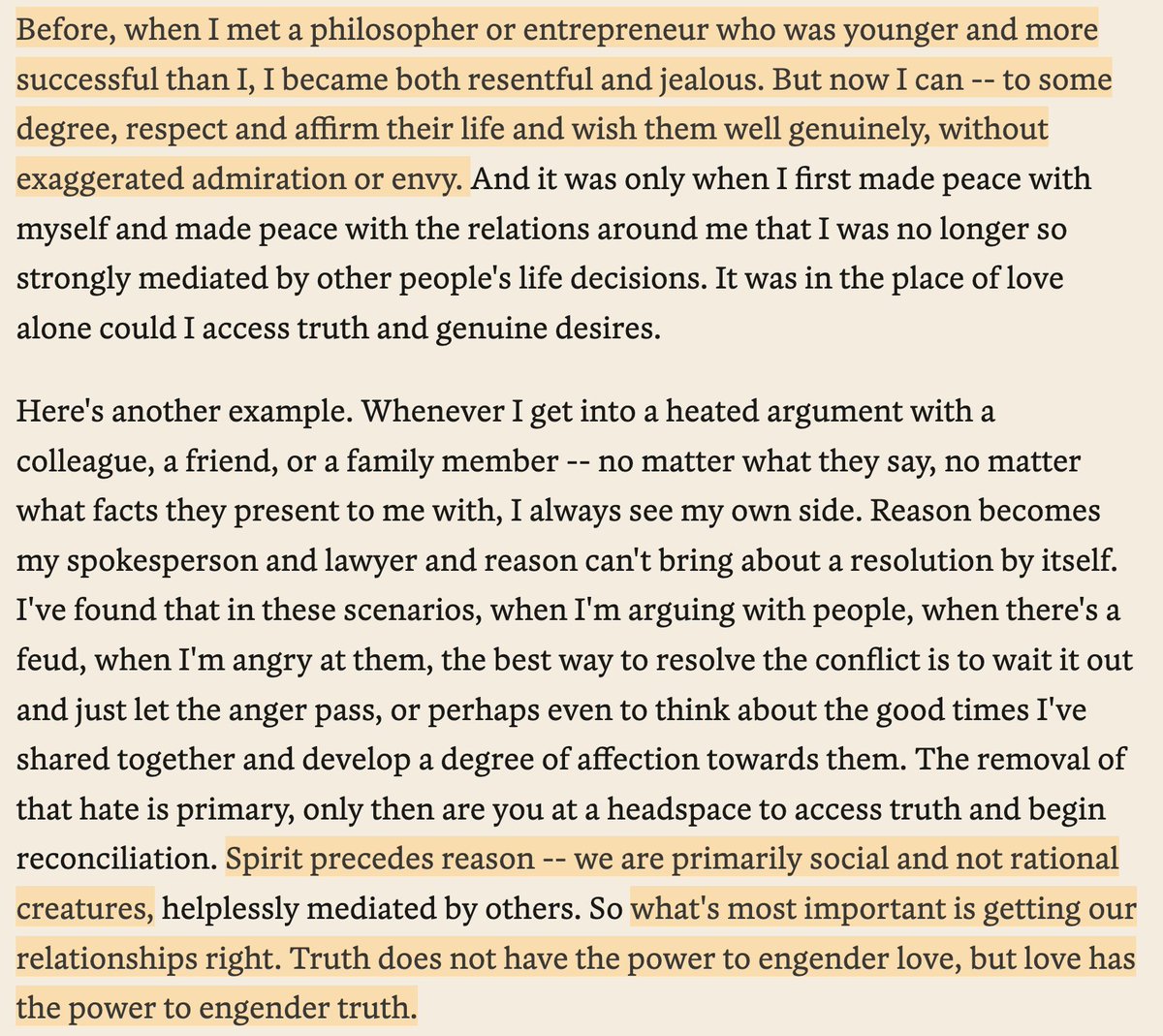 "Spirit precedes reason -- we are primarily social and not rational creatures...So what's most important is getting our relationships right. Truth does not have the power to engender love, but love has the power to engender truth."