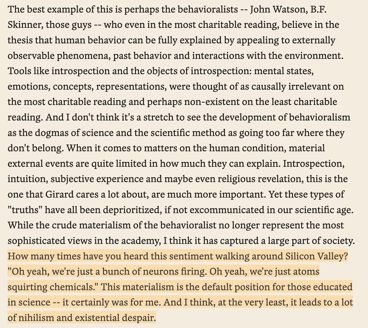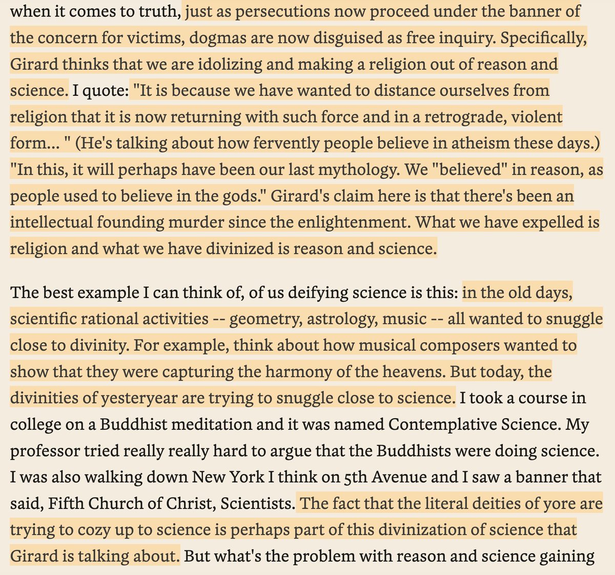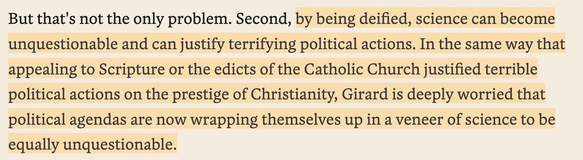 "by being deified, science can become unquestionable and can justify terrifying political actions...Girard is deeply worried that political agendas are now wrapping themselves up in a veneer of science to be equally unquestionable."