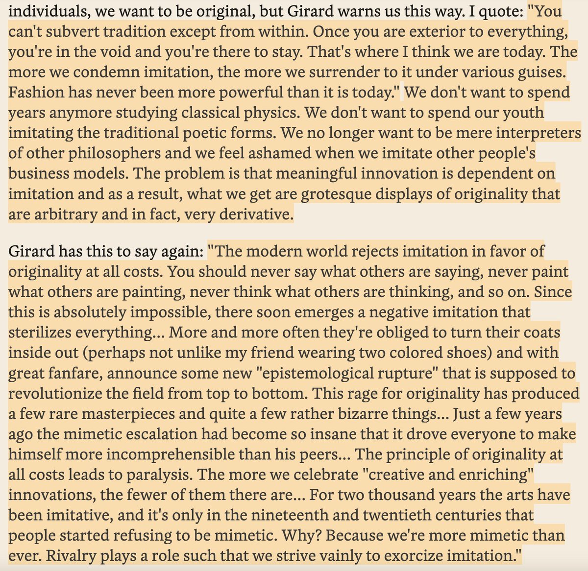 "Girard isn't convinced society has really changed that much at all -- that we've really given up persecution. Rather, it's more a superficial switch of who we think it's acceptable to persecute...'Our society's obligatory compassion authorizes new forms of cruelty.'"