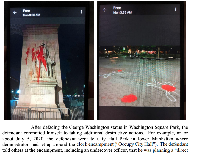 Resto defaced the George Washington statue in WSP, then told a cop he was planning on destroying the Christopher Columbus statue. He seemed quite prepared for this, having mapped out cameras to destroy