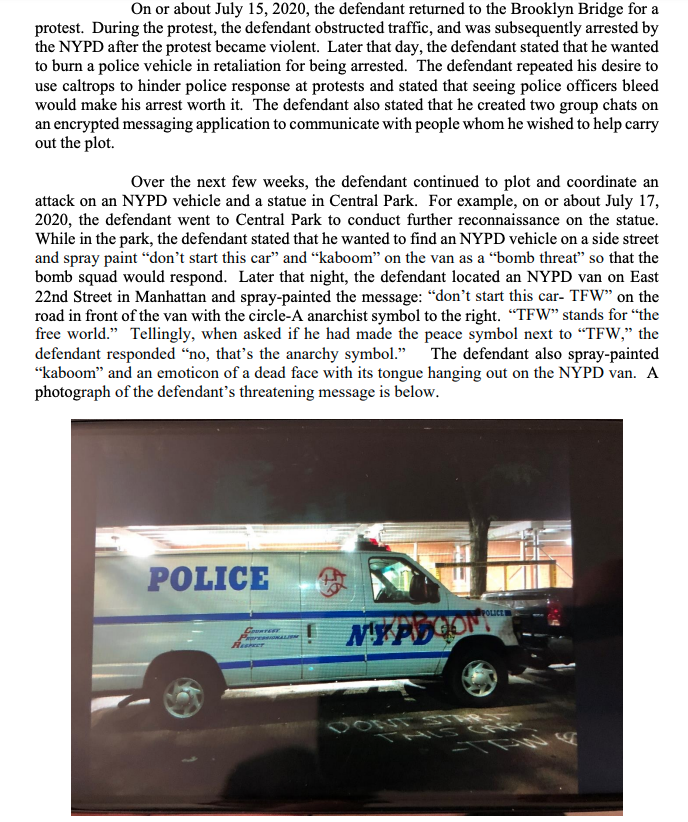 Was present at multiple BLM protests, and even arrested at one while blocking the Brooklyn Bridge. Tagged a NYPD van as a bomb threat (w/ anarchist symbol) after that