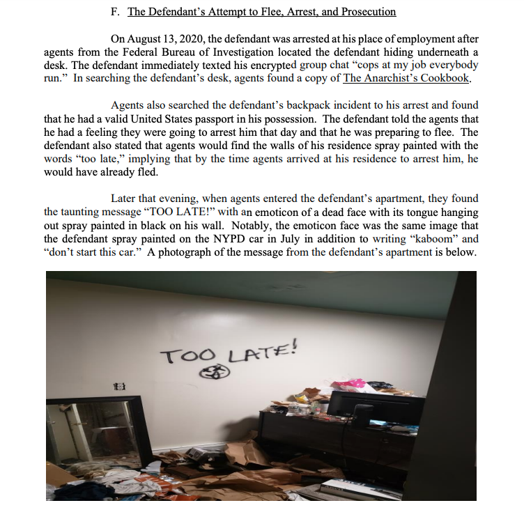 He had his passport and had graffiti'd "too late" on his apartment's wall, likely indicating he was going to flee.