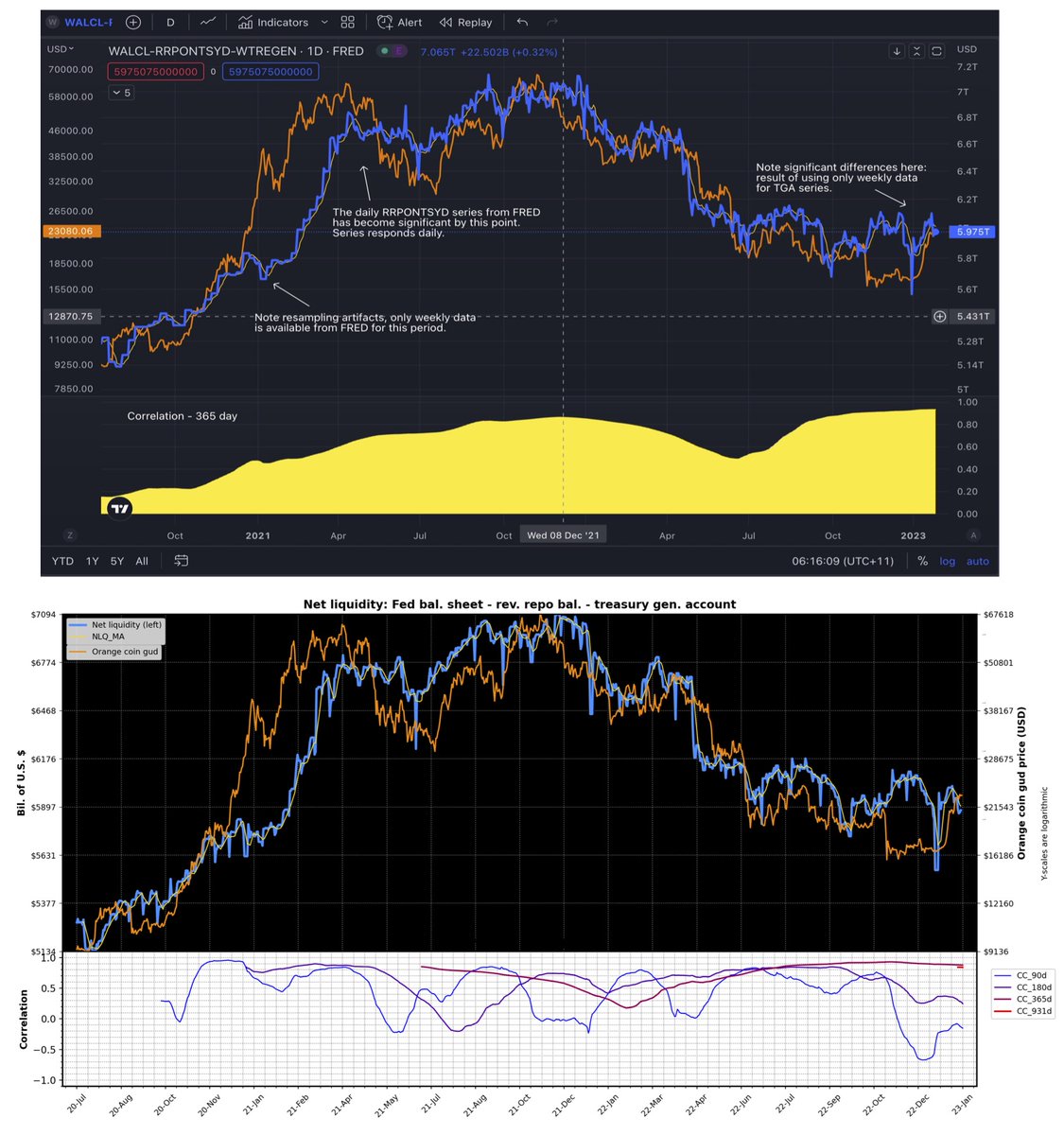 6/ My script output compared to trading view. Hard to beat a TV chart but I think mine comes close. There may be some advantage using my script as it utilizes daily TGA data. Note differences in the NLQ traces (blue) here, especially recently.