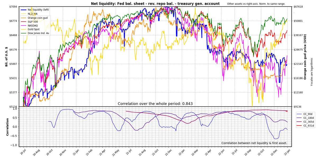2/ Following March 2020, the huge surge in net liquidity caused by unprecedented QE made this liquidity tide the primary driving force in markets. High correlation now seen between SPX, NDQ, DJI, BTC etc & NLQ. Great intro here by @maxjanderson: