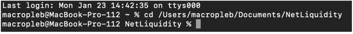 12/ Now you have python & pip, you’ll need the required modules used by the script. Type ‘cd’ and drag & drop the ‘NetLiquidity’ folder onto the terminal + hit enter. That will set it as the working directory.