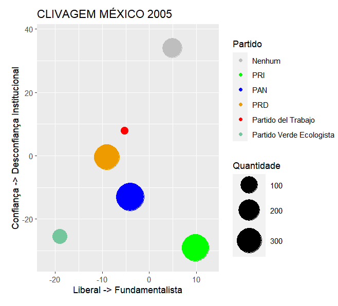 Tenho trabalhado com divisões no público aqui tento organizar duas divisões encontradas e a adesão partidária. O exemplo é o México de 2005. A fonte é o WVS, vou nos próxms tweets explicar o gráfico e apresentar o mesmo para 2018. Assim como falar de outros países .