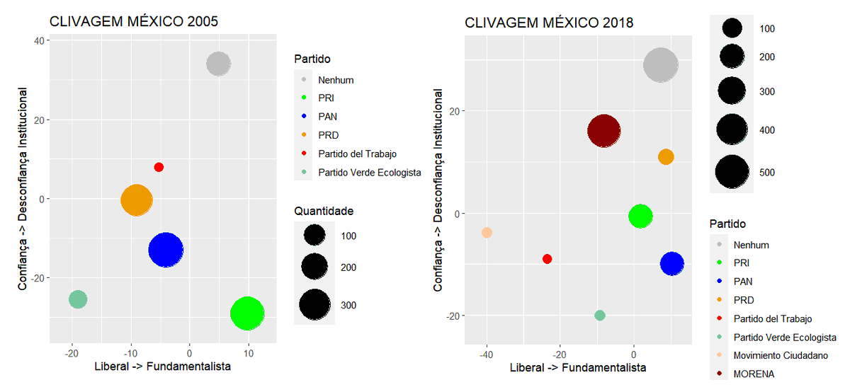 O partido MORENA vencedor das eleições mais recentes tem caracteres altamente desconfiados e posição mediana na escala liberal-fundamentalista.
