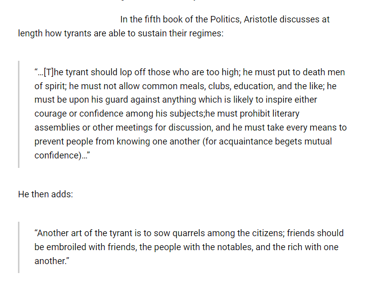 In the Politics, Aristotle describes this as one of the principal methods of tyrants: to prevent free association among men and instead to foster distrust, so that people squabble among themselves rather than uniting against their real oppressor.