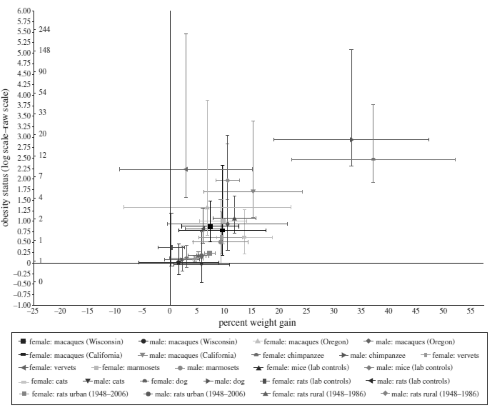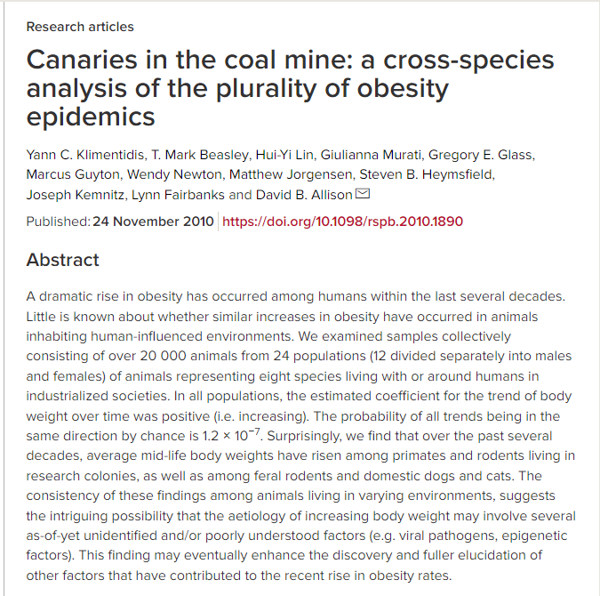 Yann Klimentidis et al. gathered data from animal studies that contained at least ten years' data for animal weights to investigate whether what's happening to humans is happening to animals as well. And guess what? Analysis of results for 20k animals showed that it is.