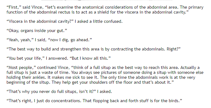 Vince's beef with the sit-up, which for many is the go-to abdominal exercise, is that it brings into play too many other muscles, especially hip flexors and lower back, and doesn't tax the abdominals enough. "Flopping back and forth... is for the birds" he said.