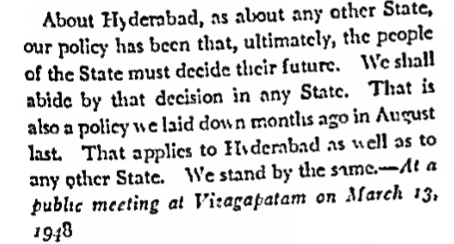 As early as March 1948, Nehru was referring to his willingness to concede to a plebiscite for Hyderabad in several speeches. This fact emboldened Kasim Razvi, the leader of the Razakars, who knew that both Nehru & Mountbatten were receptive to allow Hyderabad's independence.