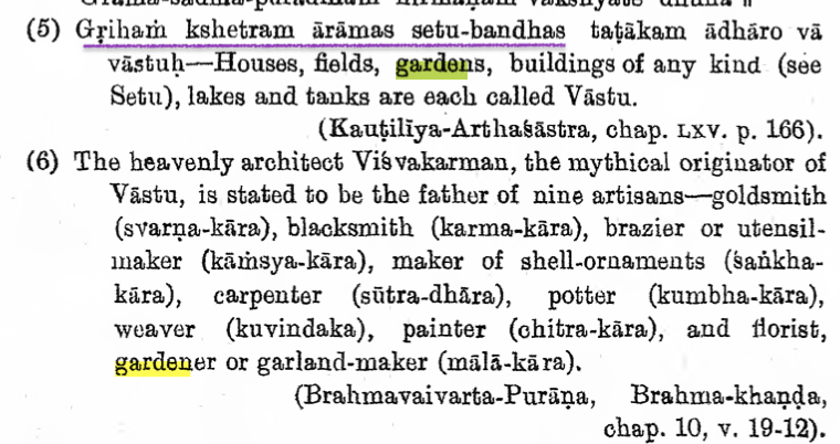 Ancient Hindu texts use several terms for gardens. Ārāma - pleasure garden is a common term used in Rāmāyana, Māhābhārata, etc. Brihat Samhitā says lakes should have gardens on their banks. Pre-Mughal inscriptions at Amaravati (13th c)., Cambay (10th c.), etc. refer to Ārāma.