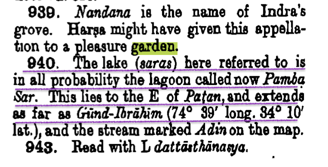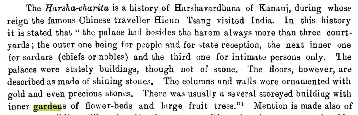 Harsha Charita, a history of Harshavardhana of Kanauj (7th c.) describes his palaces as multi storied buildings with gardens of flower-beds & large fruit trees. The Rājatarańginì (13th c.) confirms Harsha’s construction of gardens & lakes, the remains of which exist even today.