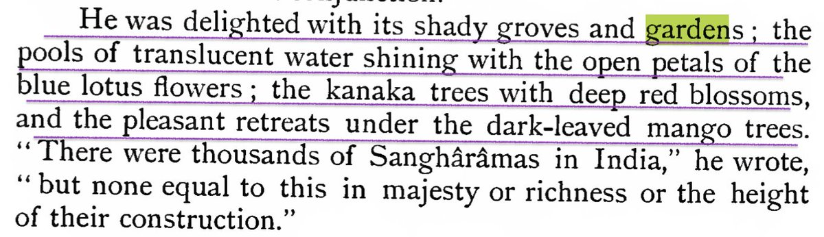 Buddhist Chinese traveller Hiuen Tsang (7th c.) who visited India during Harsha’s reign, lived at Nalanda University in Magadha for 5 years & describes shady groves & gardens with water pools full of blue lotuses, Kanaka trees with red blooms & pleasant times under mango trees.