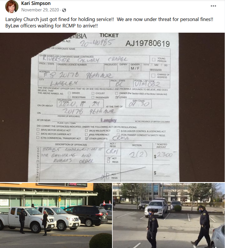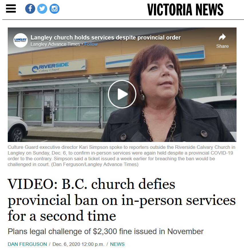 3/ Dr. Henry banned in-person religious gatherings in Nov 2020 as a new wave hit. A small # of churches defied the orders, including Riverside Calvary Chapel in Langley. "Concerned citizen" Kari was there to speak to media when police fined the church. (jccf.ca/wp-content/upl…)