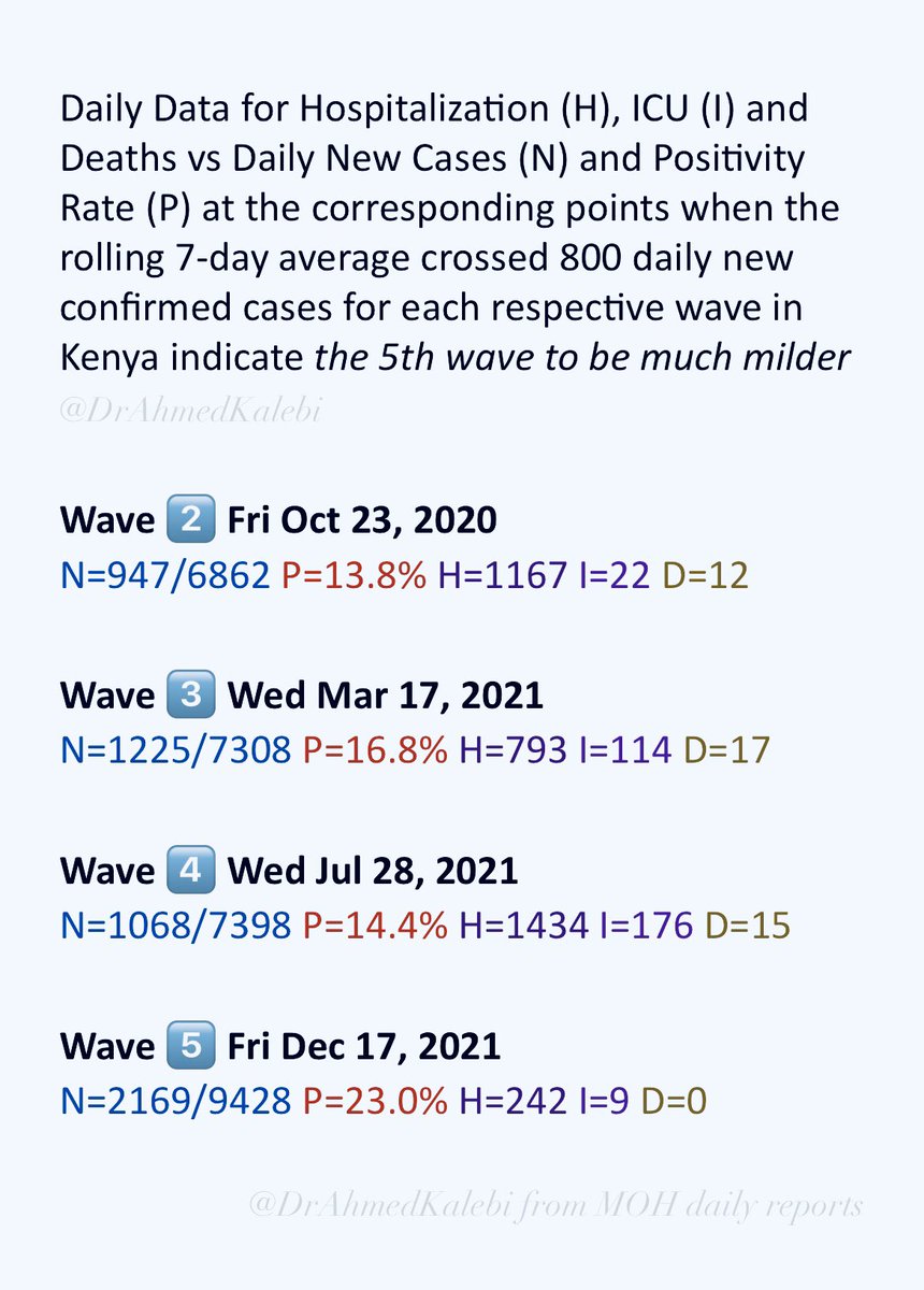 Daily Data for Hospitalization, ICU & Deaths vs Daily New Cases & Positivity Rate at corresponding points when the rolling 7-day average crossed 800 daily new confirmed cases for each respective wave in Kenya🇰🇪 indicate the 5th wave is far milder compared to previous waves👇🏾