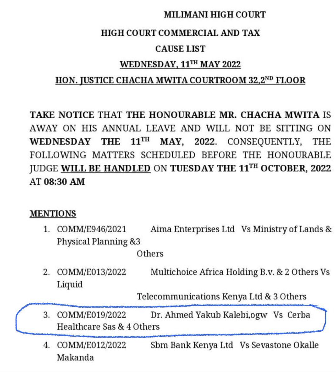 The case was due to come up for Case Management today morning before the Trial Judge Hon. Justice Chacha Mwita, but now re-scheduled to 11-10-22 bc the Trial Judge went on annual leave 😳 @DonaldBKipkorir explained to me how such a delay is not unexpected in our judicial system