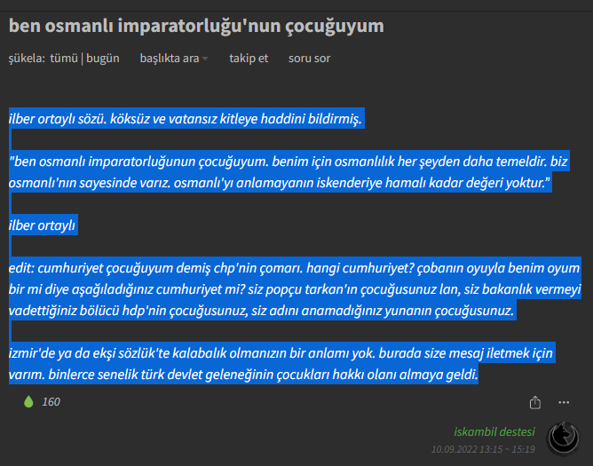 Ekşi Sözlük İlber Ortaylı'nın "ben Osmanlı İmparatorluğu'nun çocuğuyum" konuşmasına dair açılan başlığın ilk entrysini ve video linkini kaldırdı. İlber Ortaylı'nın konuşmasına dahi sansür uyguluyorlar. Sebep olarak hakaret edildiğini söylemişler. Buyurun birlikte inceleyelim.